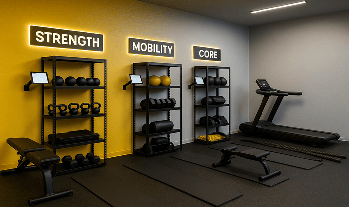 The Core Pod is designed for stability, control, and midline strength using medicine balls, ab wheels, and sliders.